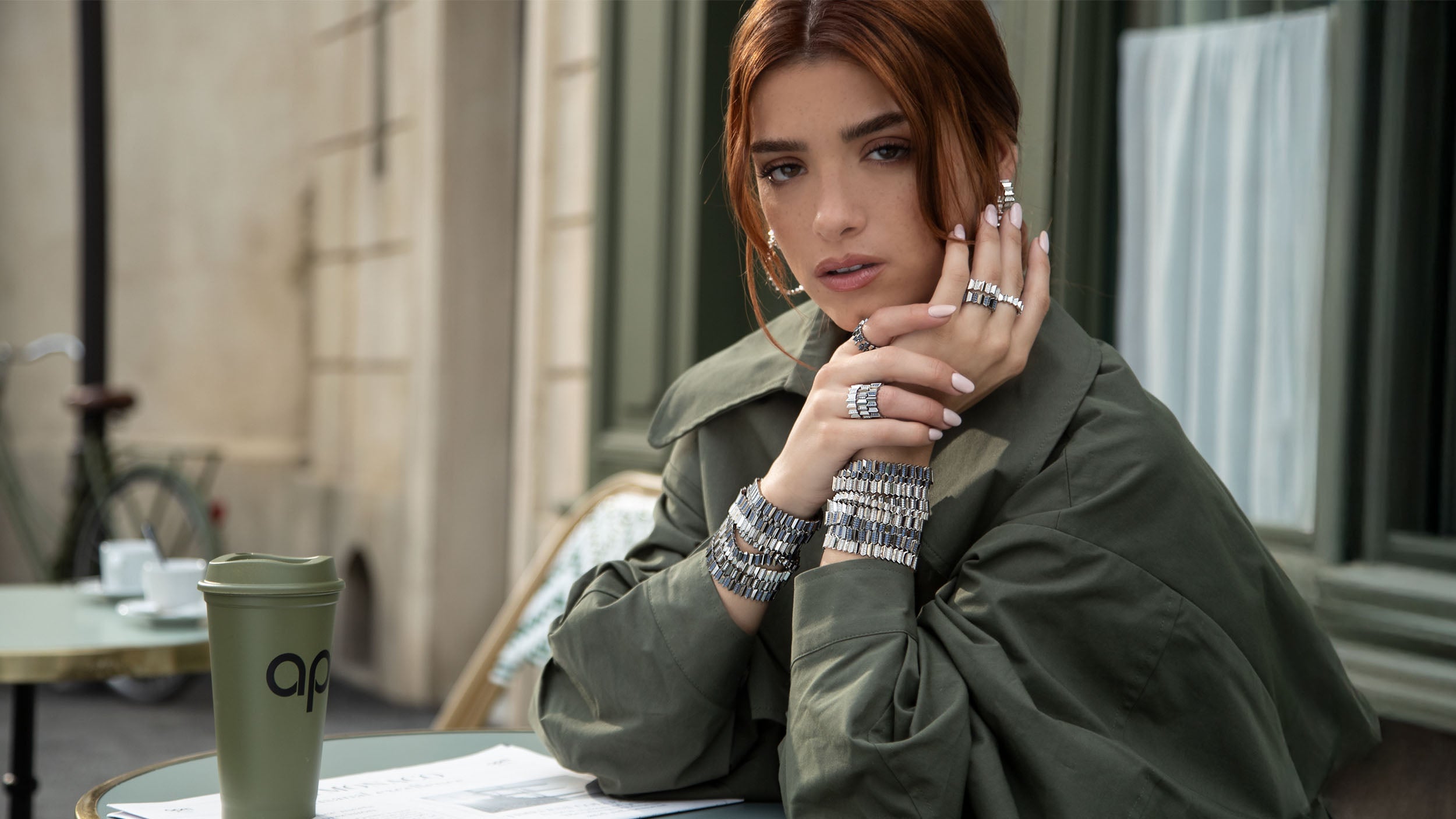Woman wearing a green coat with APM MONACO jewelry including earrings, a necklace, and rings. All jewelry from up and down  collection