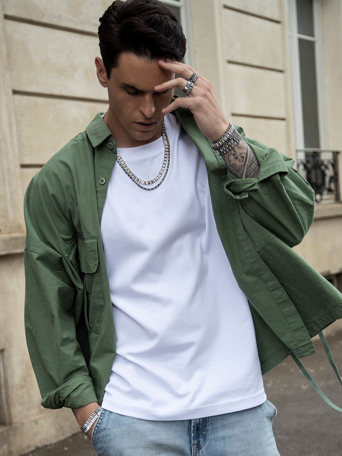 Two people standing close together outdoors, one wearing a green trench coat and the other in a green jacket and white shirt. Both of them with APM MONACO up and down jewelry set.