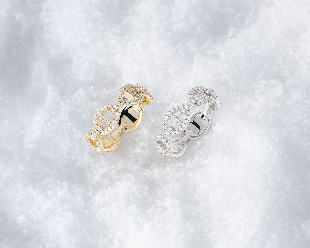 APM MONACO yacht club ring in silver on a white backgroundHand wearing a diamond ring with a blurred background
