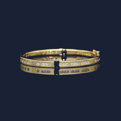 هذا السوار مصنوع من سبيكة APM صفراء مطلية بالذهب عيار 18 قيراط بطبقة 3 ميكرون ومرصع بالزركونيا على شكل مكعبات باللون الأبيض لتشكيل كلمة BONHEUR بلغة Morse Code السرية. المعنى منقوش على الجزء الداخلي أيضًا.