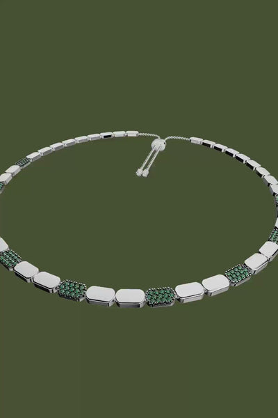 تُضفي الأحجار الخضراء المتألقة تناغمًا راقيًا على تصميم هذه القلادة، وتعزز تباينًا آسِرًا يلفت الأنظار.