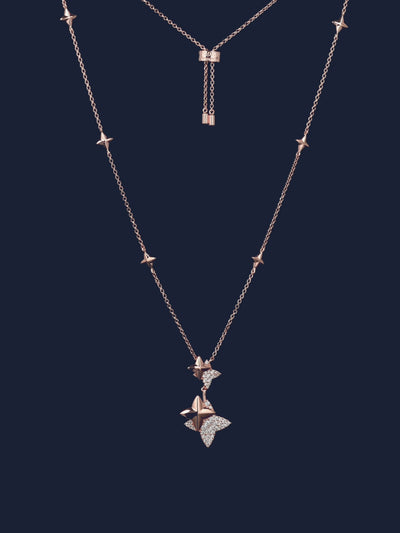 هذه القلادة مصنوعة من سبيكة APM ومطلية بالذهب الوردي عيار 18 قيراط ومرصعة بالزركونيا على شكل مكعبات باللون الأبيض.