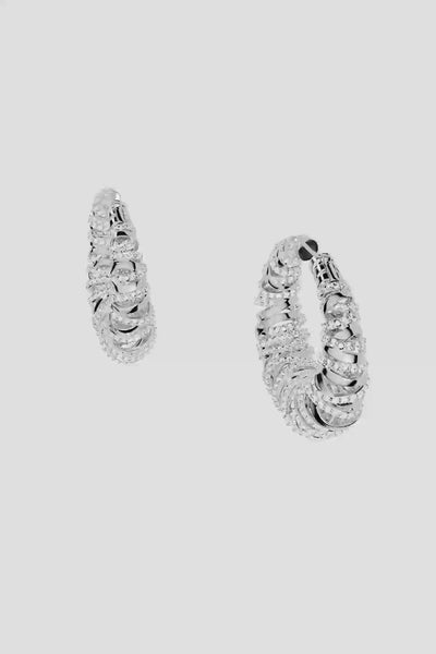 تتشابك الفضة الإسترلينية الملساء مع الترصيع Pavé الكامل لتشكل مزيجاً متناغماً وأنيقاً من الملمس والتألق. صُممت هذه الأقراط لتناسب جميع المناسبات، وتجسد الرقي والأناقة.