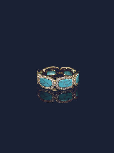 هذا الخاتم مصنوع من سبيكة APM صفراء ومطلي بالذهب عيار 18 قيراط. ومرصع بالزركونيا على شكل مكعبات باللون الأبيض ومزين بالحجر الفيروزي.