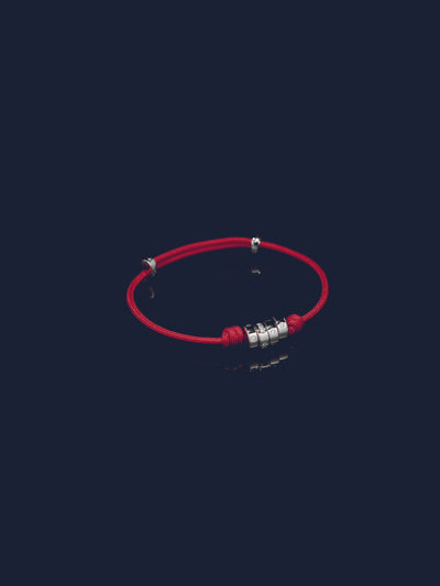 هذا السوار مصنوع من النايلون الأحمر والفضة الإسترليني. ومرصع بالزركونيا على شكل مكعبات باللون الأبيض لتشكيل كلمة LOVE بلغة Morse Code السرية.