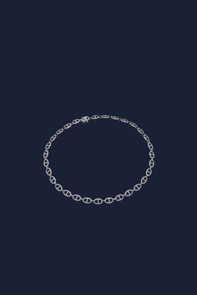 هذه القلادة مصنوعة يدويًا من الفضة الإسترليني ومرصعة بالزركونيا على شكل مكعبات باللون الأبيض.