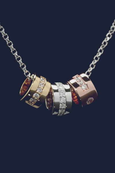 هذه القلادة مصنوعة من الفضة الاسترليني وسبيكة APM وردي ومطلية بالذهب عيار 18 قيراط بطبقة 3 ميكرون. ومرصعة بالزركونيا على شكل مكعبات باللون الأبيض.