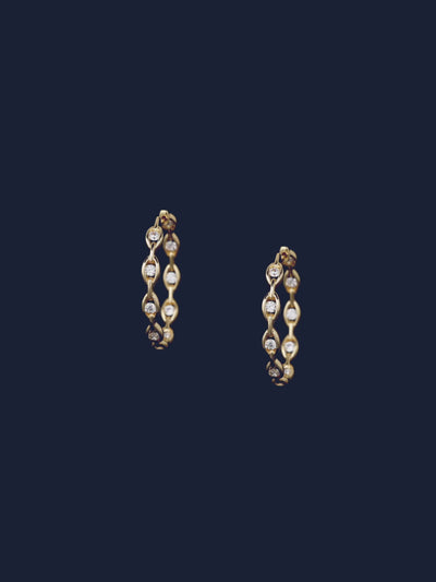 هذا الحلق مصنوع من سبيكة APM ومطلي بالذهب الأصفر عيار 18 قيراط ومرصَّع بالزركونيا على شكل مكعبات باللون الأبيض. تمنح التقنية المستخدمة في تثبيت الحلق الأحجار تأثيرًا سلسًا وراقيًا.