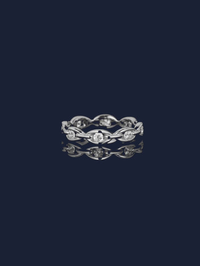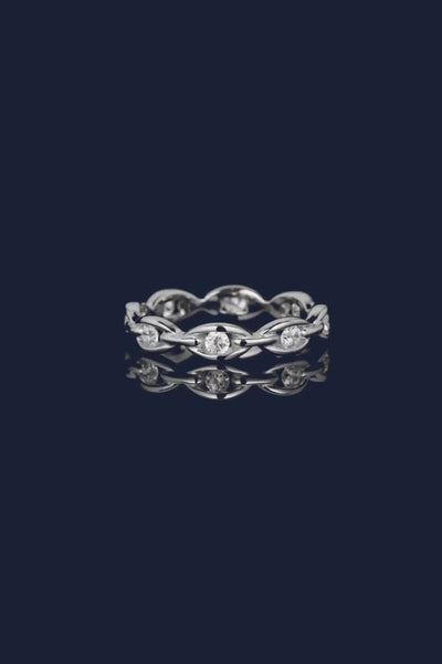 هذا الخاتم مصنوع يدويًا من الفضة الإسترليني ومرصع بالزركونيا على شكل مكعبات باللون الأبيض. تمنح التقنية المستخدمة في التركيب الأحجار تأثيرًا سلسًا وراقيًا.