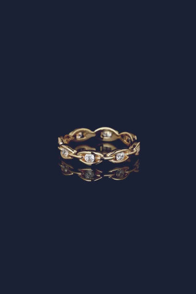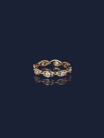 هذا الخاتم مصنوع من سبيكة APM ومطلي بالذهب الأصفر عيار 18 قيراط. ومرصع بالزركونيا على شكل مكعبات باللون الأبيض. تمنح التقنية المستخدمة في تثبيت الحلق الأحجار تأثيرًا سلسًا وراقيًا.