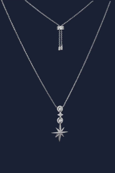 هذه القلادة مصنوعة يدويًا من الفضة الإسترليني ومرصعة بالزركونيا على شكل مكعبات باللون الأبيض.