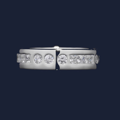 هذا الخاتم مصنوع يدويًا من الفضة الإسترليني ومرصّع بالزركونيا على شكل مكعبات باللون الأبيض لتشكيل كلمة SMILE بلغة Morse Code السرية. المعنى منقوش أيضًا على الجزء الداخلي.