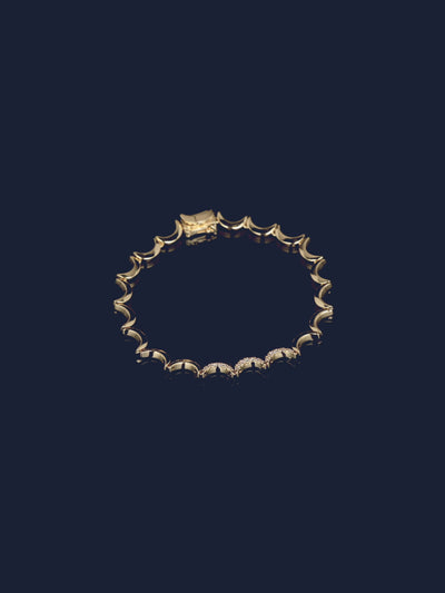 هذا السوار مصنوع من سبيكة APM ومطلي بالذهب الأصفر عيار 18 قيراط ومرصّع بالزركونيا على شكل مكعبات باللون الأبيض.
