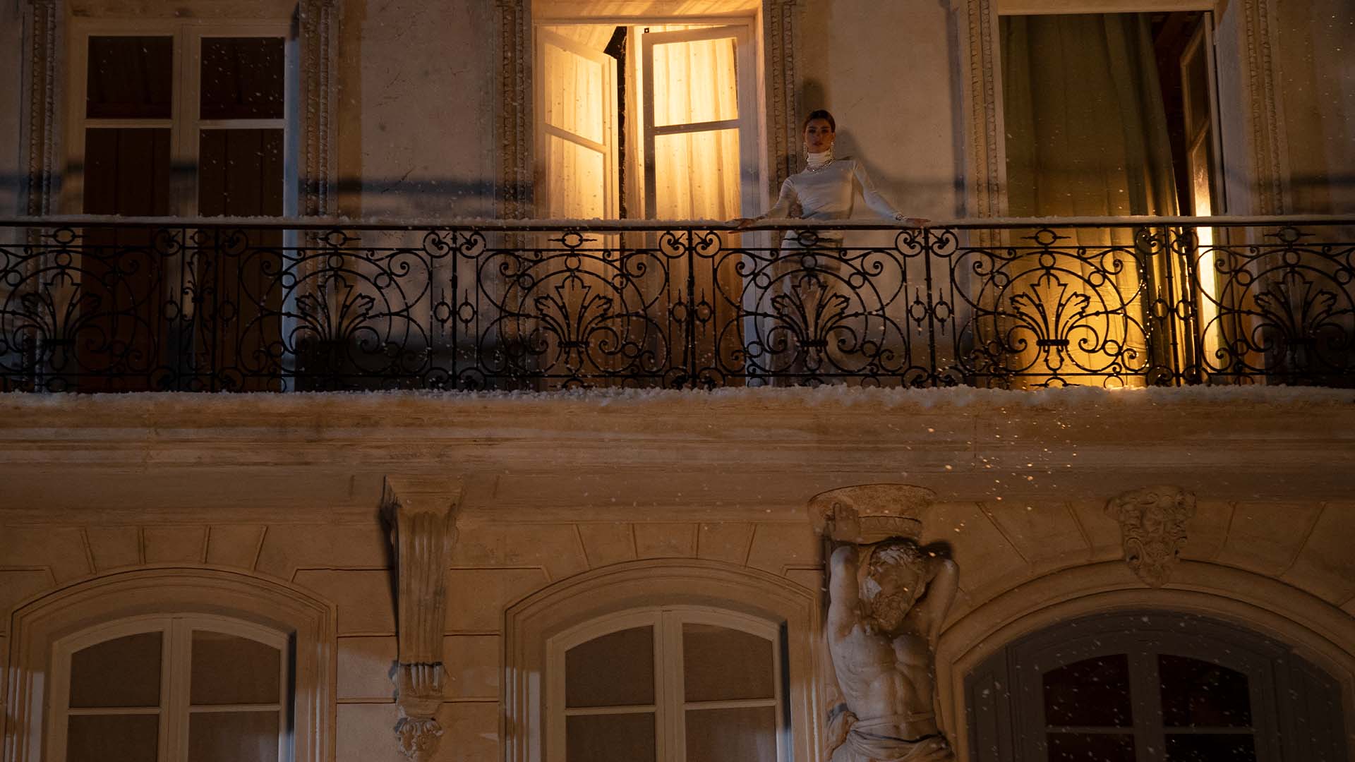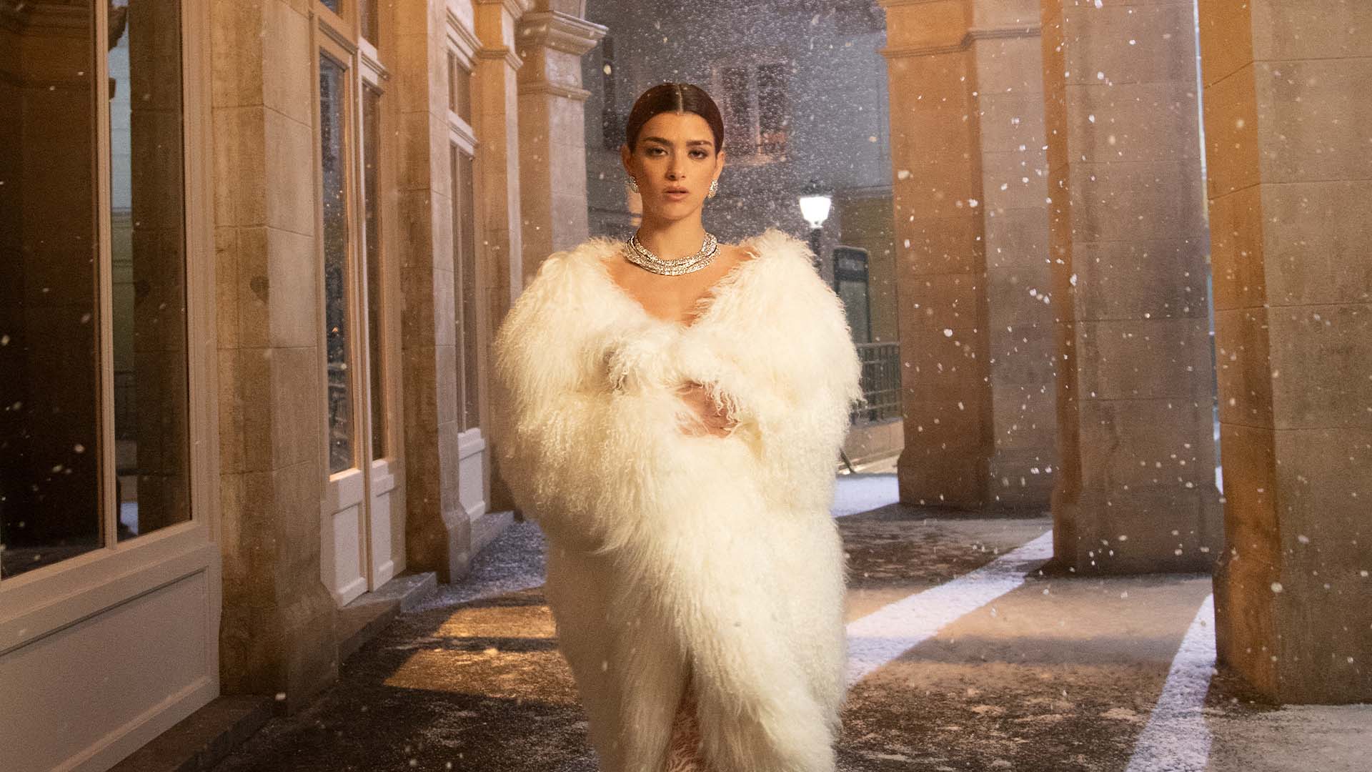 APM MONACO silver necklace with heart-shaped pendant on a white backgroundNecklace with a heart-shaped pendant from APM MONACO on a person and wearing a white feathered garment.