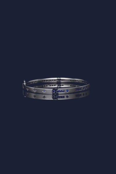 This bangle is handcrafted from sterling silver. It is microset with blue cubic zirconia to form the word BONHEUR in Morse Code secret language. The meaning is also engraved inside.