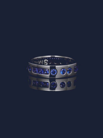This ring is handcrafted from sterling silver and microset with blue cubic zirconia to form the word SMILE in Morse Code secret language. The meaning is also engraved inside.