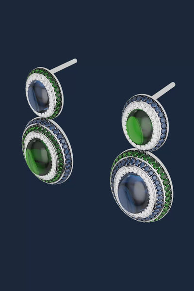 These captivating pieces pavé with vibrant green and sapphire-blue stones blend sophistication and edgy aesthetic. The light shines through, creating a radiant effect.