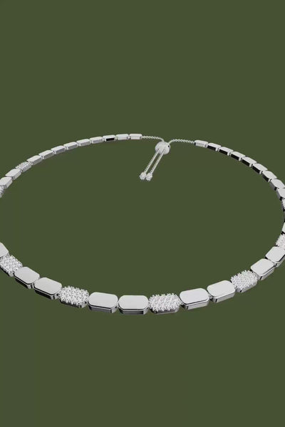 The radiant stones elegantly complements this necklace's design, creating a captivating contrast.