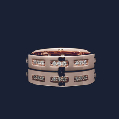 This ring is made with APM Rose Alloy and 18k gold plated layer of 3 microns. It ismicroset with white cubic zirconia.