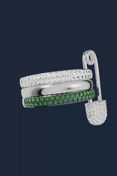 Inspired by the classic safety pin, this ring combines fashion and sparkles with the layered design.